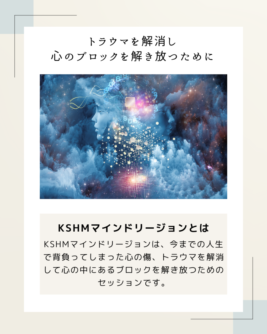 古代の王キングソロモンが編纂した、偉大な7つのモダリティ(キングソロモンヒーリングモダリティ・シリーズ)の2つ目として開示されたものが、マインドの領域に有効な「KSHM(キングソロモンヒーリングモダリティ)マインドリージョン」です。(現在、3つのモダリティが公開されています。)